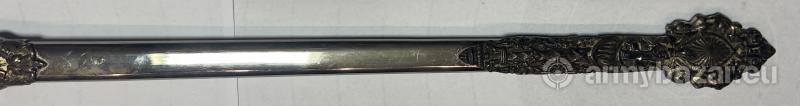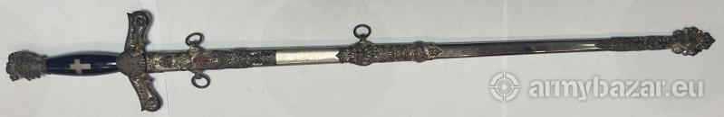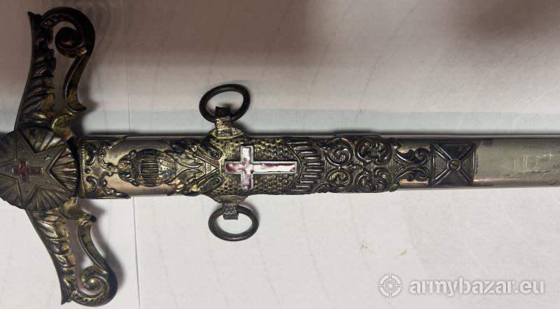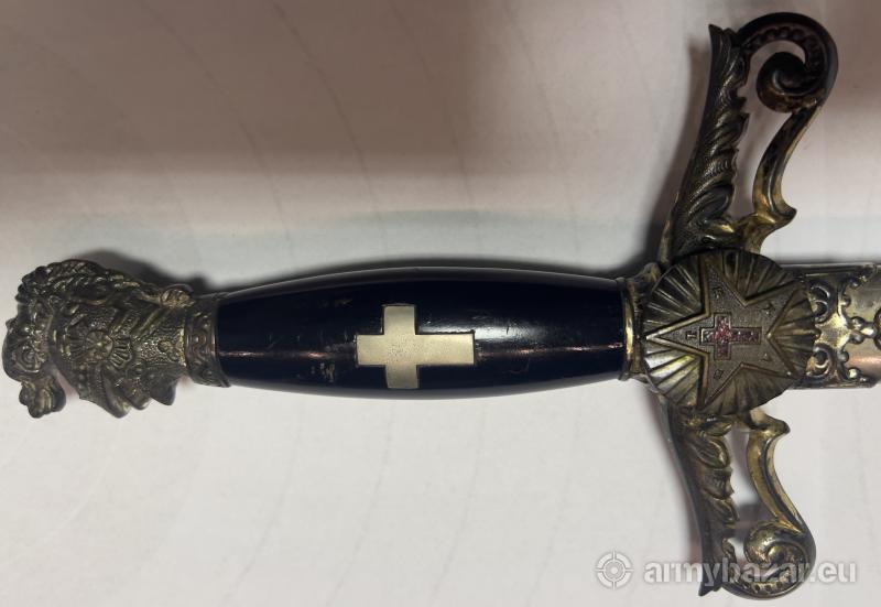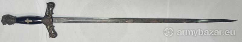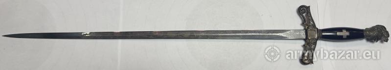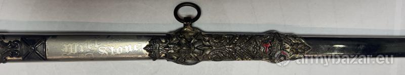 Opis: Imienny Miecz Masoński Henderson Ames Co. Oryginał XIX-XX wiek /WILL STONE/ Unikatowy paradny miecz masoński z końca XIX wieku. Miecz wykonany został przez jednego z najbardziej znanych i renomowanych producentów mundurów i rynsztunku w Stanach Zjednoczonych - Henderson-Ames Company of Kalamazoo, Michigan- słynącego z wyrobów m.in. dla tajnych stowarzyszeń. Miecz jest imienny. Ostrze szczególnie ozdobne. Po jednej stronie ostrza wygrawerowane imię i nazwisko właściciela. Na ostrzu przy rękojeści nazwa producenta. Pochwa zdobiona - długość głowni - 71cm; - długość całkowita bez pochwy - 90 cm; - długość całkowita z pochwą - 96,5 cm;