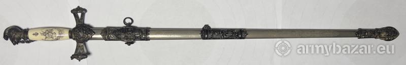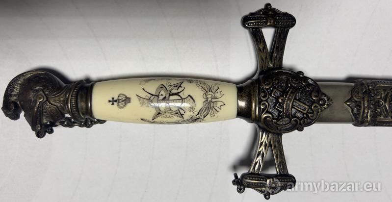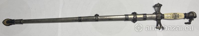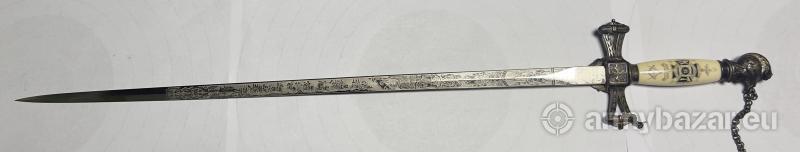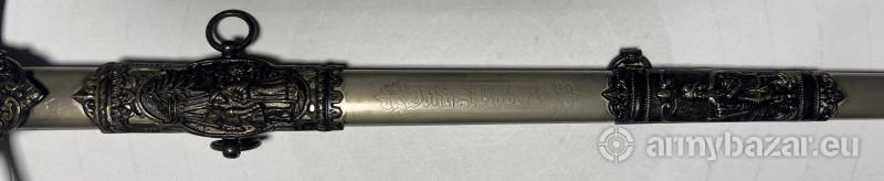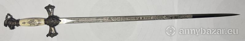 Opis: Imienny Miecz Masoński Oryginał XIX-XX wiek Unikatowy paradny miecz masoński z końca XIX wieku. Miecz jest imienny. JOHN S. ROBERTS Ostrze szczególnie ozdobne. Po jednej stronie ostrza wygrawerowane imię i nazwisko właściciela. Pochwa zdobiona - długość głowni - 71cm; - długość całkowita bez pochwy - 90 cm; - długość całkowita z pochwą - 93,5 cm;