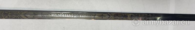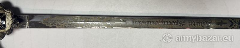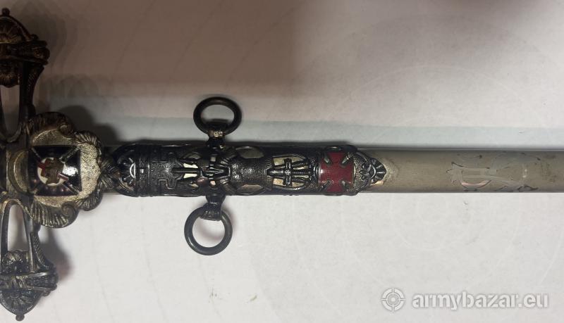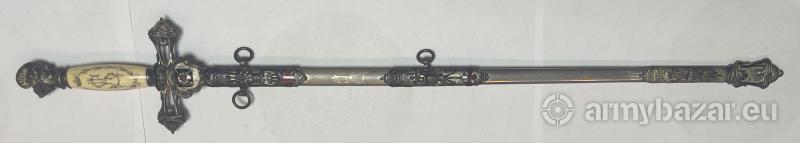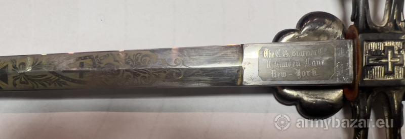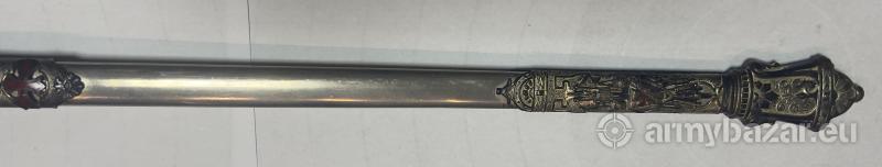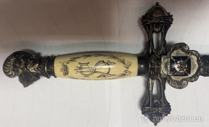Opis: Imienny Miecz Masoński Oryginał XIX-XX wiek /ADAM SPANGENBERG/ Unikatowy paradny miecz masoński z końca XIX wieku. Miecz jest imienny. Ostrze szczególnie ozdobne. Po jednej stronie ostrza wygrawerowane imię i nazwisko właściciela. Pochwa zdobiona - długość głowni - 71cm; - długość całkowita bez pochwy - 90 cm; - długość całkowita z pochwą - 96,5 cm;