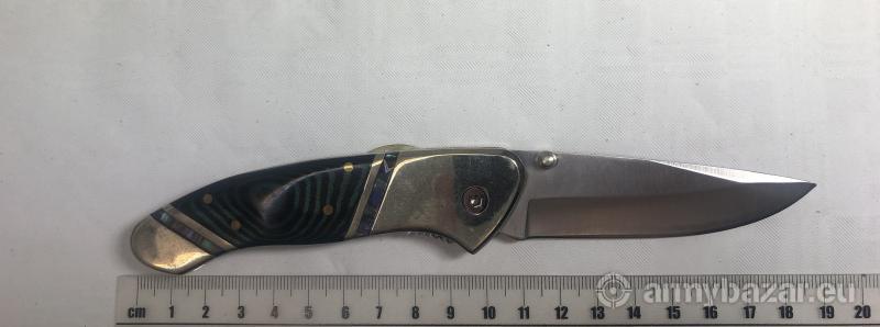 Opis: Scyzoryk firmy HERBERTZ SOLINGEN Nóż składany średniej wielkości bogato zdobiony, którego rękojeść wykonano ze stali nierdzewnej z mosiężnymi okładzinami połączonymi z Micartą barwioną w odcieniach ciemnej zieleni. Głownię o profilu Drop point - ostrze doskonałe na nóż roboczy, krzywizna ułatwia cięcia- wykonano ze stali nierdzewnej AISI 420 o grubości 3 mm. Nóż dobry zarówno dla praworęcznych i leworęcznych. W pozycji otwartej głownia blokowana jest blokadą Liner Lock, której niezawodność gwarantuje odpowiednia grubość i wytrzymałość sprężyny blokującej.